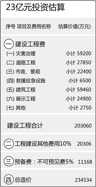 據介紹,位于北川中學的博物館及集中用房建筑面積共45000平方米,每平方米造價為3000元,“加上周邊服務設施,造價一共為1.35億元。依據23.45億元的項目投資估算,博物館及集中用房的建筑費用,只占北川地震遺址博物館總造價的1/18。”林川說。