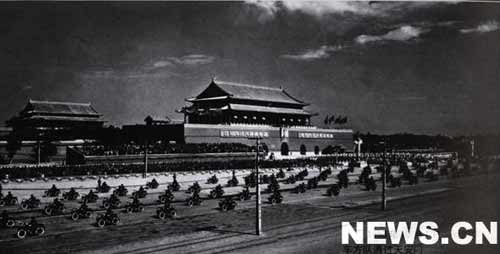 閱兵式開始。中國人民解放軍朱德總司令乘車馳過整隊(duì)而立的部隊(duì)前面,檢閱并向他們致節(jié)日的祝賀。閱兵后,朱德總司令登臨檢閱臺(tái)宣讀《中國人民解放軍總部給全國武裝部隊(duì)的命令》。