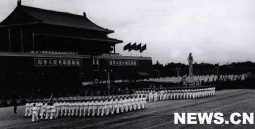 保衛著祖國領海的水兵們,通過廣場后,百倍警惕地保衛著社會主義建設的中國人民解放軍公安軍繼續行進。