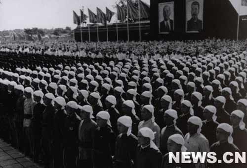 毛澤東主席同他的親密戰友劉少奇、周恩來、朱德、陳云、鄧小平以及黨和國家的其他領導人,在萬眾歡呼聲中,在天安門城樓檢閱了中國人民解放軍和群眾游行隊伍。