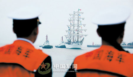 彩旗在風中飄揚,禮炮在空中響起。4月18日晚7時許,美麗的青島港迎來了參加中國海軍60周年慶典的第一位“客人”——墨西哥的“夸烏特莫克”號風帆訓練艦。慶祝中國海軍成立60周年多國海軍活動,由此拉開了帷幕。