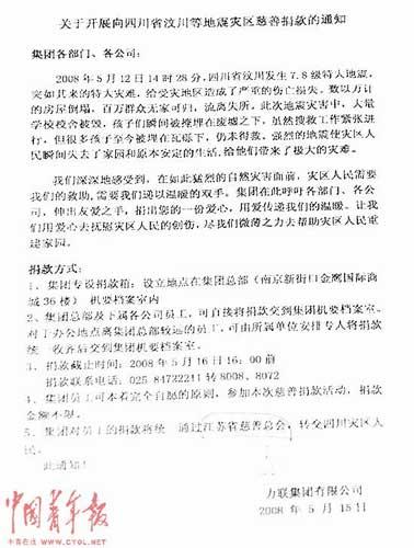 中國青年報記者多次采訪了其中的一名員工劉燕寧。劉燕寧告訴記者她就是捐款的經辦人。2008年5月15日,汶川特大地震發生后,經請示力聯集團負責人翟韶均,力聯集團發出了《關于開展向四川省汶川等地震災區慈善捐款的通知》,號召廣大員工向災區捐款。這一倡議得到了廣大員工的響應和支持,很快,捐款源源而來。在指定的捐款截止日期——5月16日16:00前,公司募集到了地震捐款41423.1元。