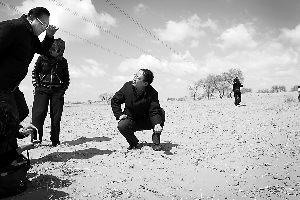 郭虎帶著氣象臺的年輕預報員,進入一處沙地。當時風很大,吹得大家睜不開眼睛,“瞬間風力能達到五六級!辈贿^,沒有沙塵。郭虎蹲下去,用手抓起一把沙子,一松手,沙子被吹出不遠就飄落了!斑@說明沙子里的水分很多!惫⒂檬峙倨鹕匙觼,深不到1厘米的表層下,沙子都是濕的。