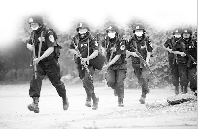 經(jīng)過1小時的現(xiàn)場處置,當(dāng)?shù)鼐綄ⅰ翱植婪肿印眹?yán)密封控在工廠一區(qū)域內(nèi)。但“恐怖分子”沒有絲毫棄械投降的意思,仍舊挾持人質(zhì)與警方對峙,并威脅炸毀化工設(shè)施。此時,接到報警的河北省反恐指揮中心迅速啟動省級反恐預(yù)案,成立省級反恐指揮部,并派省級公安特警、武警、消防、衛(wèi)生、氣象和環(huán)保力量,迅速趕往涿州現(xiàn)場增援處置。與此同時,國家也緊急調(diào)派國家反恐應(yīng)急處置力量——— 武警“雪豹突擊隊”和解放軍“三防醫(yī)學(xué)救援隊”前往現(xiàn)場增援。