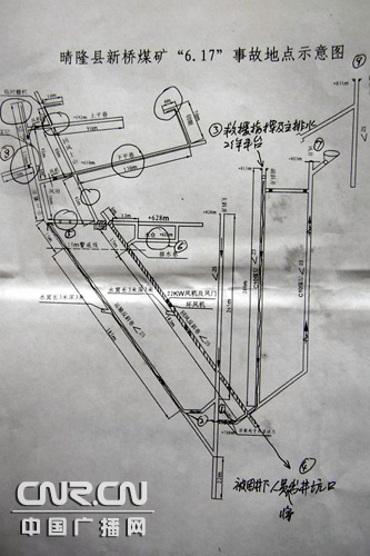 示意圖說明:1為井下排水水倉;2為新儲備水倉;3為救援指揮部及主排水口平臺;4為井下被困人員可能的出井通道;5為井下木料堆積巷道,估計有兩人,水位較低;6為煤礦排水倉,知情人介紹,有事故煤礦礦工固定在此位置排水。7為救援送風口之一;8為人員可能的所在位置,其他畫圈地方為事故發生時井下被困人員可能存在的地方;9為另一送風口。