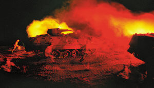 “新大綱規(guī)定,夜訓按照年度訓練總時間20%的比例安排。今年,我們著力提高夜間單兵專業(yè)技能的生成和轉(zhuǎn)化。”盛團長話音剛落,伴著隆隆的炮擊聲,夜暗深處火光頻閃。原來,該師新型教練員、二營教導員杜文斌正在組織官兵進行坦克夜間教練射擊課目訓練。眼前景象大出記者意料:目標顯示不再是一盞孤燈,而是以打信號彈、模擬射擊火光和車輛閃爍明滅的燈光等多種方式,大大增加了射擊難度。“敵人射擊炮口一閃,你能不能馬上回敬一炮?我們練的就是這個!”杜文斌自豪地說。