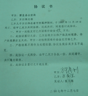 7月1日本報(bào)(燕趙都市報(bào))刊發(fā)的《疑犯被逼喝涼水致終身殘疾》如一石擊水,讓"牢頭獄霸"、"躲貓貓"、"喝涼水"再次成為社會關(guān)注的焦點(diǎn)。而令人震驚的是,在調(diào)查秦英偉"喝涼水"致殘案過程中,本報(bào)記者又有驚人發(fā)現(xiàn):同是贊皇縣看守所,2007年4月至11月半年多時(shí)間內(nèi),兩個(gè)在押疑犯暴斃,最后都由當(dāng)?shù)毓膊块T出錢"協(xié)商解決",一位死者家屬給了"困難補(bǔ)助金"9萬元,另一位死者的家屬給了1.5萬元。