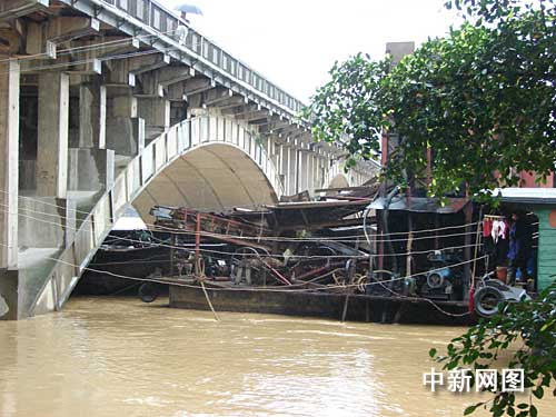 中新網柳州7月5日電 (李建明 王剛)廣西柳州市柳城縣柳城大橋險情今天暫時得以緩解——7月3日晚,三艘百噸級采砂船被洪水沖至大橋橋拱,并死死卡住大橋,加上大橋本身正在搶修,情況異常緊急。