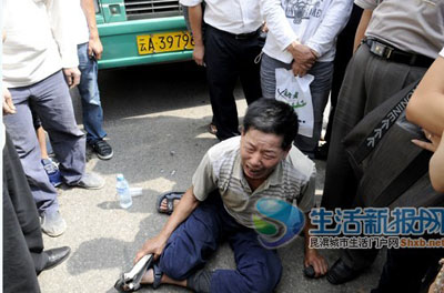 一名50多歲的男子擋在一輛77路公交車前,坐在地上痛哭,民警怎么勸說(shuō)他也不愿意離開(kāi)。男子稱:“這些城管太不講道理了,他們快把我的兒子打死了。”據(jù)該男子介紹,20多名城管人員昨日早上將其兒子打傷,兒子被送進(jìn)醫(yī)院搶救,而打人的城管全部跑了,“實(shí)在是沒(méi)有辦法,我兒子不能白白受罪,無(wú)奈之下,我只能通過(guò)這種方法引起相關(guān)部門的重視。”