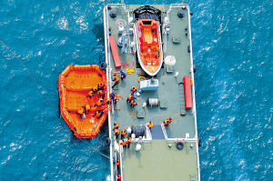 接到求救信號后,海上指揮所迅速派出各支救援分隊趕往事發(fā)海域。艦載救護直升機、海上傷員搜索定位裝置、拋射式救生索、救生吊桿、漂浮擔架、漂浮式救生網(wǎng)、救生浮臺、充氣滑梯等10多種新型海上醫(yī)療救護裝備紛紛亮相,大顯身手,上演了一幕幕扣人心弦的海上生命大救援。