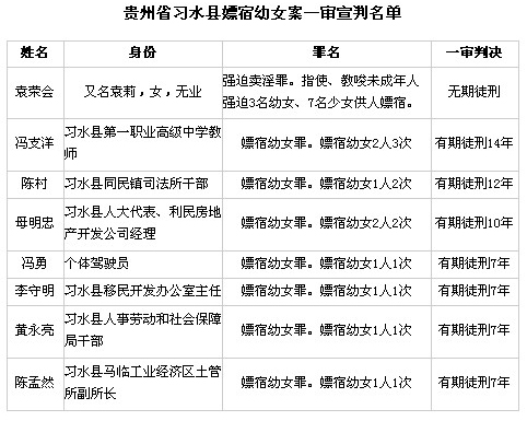 其中,被告人馮支洋(習水縣第一職業高級中學教師)嫖宿幼女2人3次;被告人陳村(習水縣同民鎮司法所干部)嫖宿幼女1人2次;被告人母明忠(習水縣人大代表、利民房地產開發公司經理)嫖宿幼女2人2次;被告人馮勇(個體駕駛員)、李守明(習水縣移民開發辦公室主任)、黃永亮(習水縣人事勞動和社會保障局干部)、陳孟然(習水縣馬臨工業經濟區土管所副所長)分別嫖宿幼女1人1次。