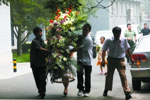 上午11時許,原國家體委主任伍紹祖前來吊唁,他身著黑色西服,面色凝重,他看著工作人員從車上卸下花圈后進入大院。