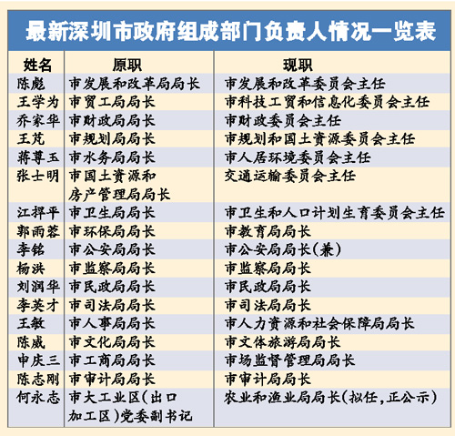 具體是,繼續(xù)留任的5人:李銘留任深圳市公安局局長;楊洪留任市監(jiān)察局局長;劉潤華留任深圳市民政局局長;李英才留任深圳市司法局局長;陳志剛留任深圳市審計(jì)局局長。