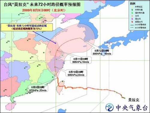 預計,“ 莫拉克 ” 將以每小時10公里左右的速度向北偏西方向移動,并將于今天下午到夜間在福建連江到浙江樂清一帶沿海登陸。
