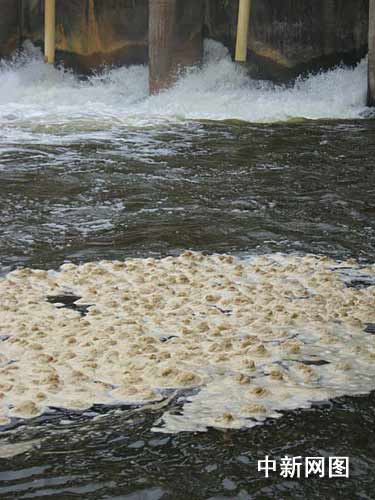 中新社徐州八月九日電 (邵國棟)記者今天來到受嚴重砷污染的江蘇省邳州市邳城鎮城河節制閘現場,十余名工人正在閘站上往河道里投放一種黃色的粉末。工人稱這種叫三氯化鐵的化學物質主要用來降低水體砷化物濃度,他們已經在此晝夜堅守多日。