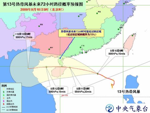 中新網9月10日電 中央氣象臺10日6時發布臺風橙色警報:南海熱帶低壓于今天早晨加強為今年第13號熱帶風暴,今天早晨5時風暴中心位于海南省文昌市東偏南方向大約550公里的海面上,就是北緯18.8度、東經116.0 度,中心附近最大風力有8級( 18 米 / 秒)。