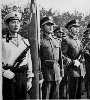 1949年10月1日開國大典,因為全軍沒有統一的服裝,按照閱兵指揮部的要求,受閱的陸軍部隊全部著黃綠色軍裝,頭戴鋼盔,帽徽為“八一”紅五星,左胸前佩戴印有“中國人民解放軍”字樣的長方形胸章。受閱的海軍方隊,干部戴白色大檐帽,扎白色腰帶;戰士戴白色水兵帽,腦后飄動著兩條黑色緞帶,身著藍白相間的;攴?哲婏w行員身著飛行服駕機受閱。受閱的女兵則穿著黃色的連衣裙。