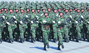 “特種兵迷彩服土黃色,易城市作戰;空降兵淺灰色和藍天的背景相似,草綠色的二炮更適合野外,新款武警軍帽上的金色飾條,則讓武警顯得威武。”一位現場的教官說。