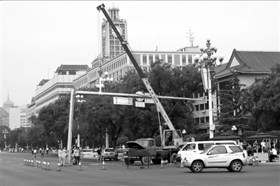 為保證來自四面八方的彩排隊伍能順利入場、退場,昨天下午,相關部門對彩排隊伍必經路段上的橫臂式信號燈進行暫時拆除,因為此類信號燈具有指揮四面交通的功能,體積稍顯龐大,在有大規模的游行隊伍通過時,會造成不便。