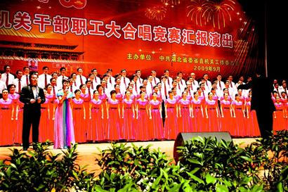 由省直機關(guān)工委主辦的“歌唱祖國——省直機關(guān)干部職工大合唱”競賽活動,是省委、省政府慶祝新中國成立60周年系列慶典的重要內(nèi)容。自今年6月啟動以來,省領(lǐng)導(dǎo)高度重視,各部門大力支持,廣大干部職工積極響應(yīng),共組織100支隊伍、8000余人參賽,1萬多名干部職工到現(xiàn)場觀摩,省委書記羅清泉、省長李鴻忠等省領(lǐng)導(dǎo)和省直各部門主要負責同志帶頭參加演唱。參加匯報演出的22支隊伍,代表省直各條戰(zhàn)線,用精彩的演出,唱響共產(chǎn)黨好、社會主義好、改革開放好、偉大祖國好、各族人民大團結(jié)好的主旋律,展示了省直機關(guān)干部職工良好的精神風貌。(記者徐和平、通訊員胡振剛)