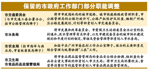 此輪改革中涉及調(diào)整、撤并的機(jī)構(gòu)共有29個(gè)。調(diào)整后,廣州市政府工作部門和辦事機(jī)構(gòu)從49個(gè)精簡為40個(gè)。此外,設(shè)部門管理機(jī)構(gòu)2個(gè):廣州市勞動(dòng)教養(yǎng)工作管理局和廣州市城市管理綜合執(zhí)法局。現(xiàn)有的市政府派出機(jī)構(gòu)將保留4個(gè)撤銷1個(gè)。