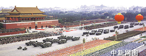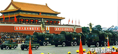 新中國五十周年國慶閱兵二十五個戰車方隊中最后四個方隊展示的是中國自力更生研制的戰略、戰術地地導彈系列,顯示中國常規與核戰略導彈反擊力量的整體作戰能力,受閱戰略導彈體積小了、威力更大了、機動性更強了,已從過去的固定發射形式發展到野外機動發射,具有全方位、全天候作戰能力和較強的防偵察、抗干擾能力。