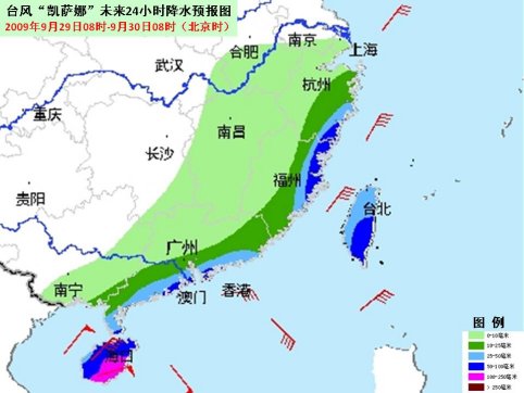 受“凱薩娜”及其外圍云系的影響,29日白天到夜間,南海大部海面、北部灣海面、瓊州海峽、海南沿海、廣西沿海將有7~9級大風,“凱薩娜”中心經過的附近海面或地區(qū)的風力將有10~13級大風,陣風可達14~16級;巴士海峽、巴林塘海峽、臺灣海峽、臺灣以東海面、廣東沿海、福建中南部沿海也將有6~7級大風,陣風可達8~9級;浙江東南部、福建東部、臺灣、廣東南部、海南等地有大雨或暴雨,海南南部的局部地區(qū)有大暴雨或特大暴雨。