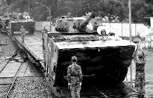 離幾名照相的戰士不遠,一輛準備離開的受閱戰車上,一名隊員站在導彈發射架頂端,右手的抹布使勁擦拭著裝備。擦完,仔細看看,再擦。不遠處,幾名隊員正在平板火車上固定裝備。