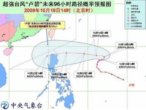 18日17時,“盧碧”的中心位于菲律賓馬尼拉東偏北方大約1400公里的西北太平洋洋面上,就是北緯17.5度、東經133.8度,中心附近最大風力有16級(55米/秒),中心最低氣壓為925百帕。