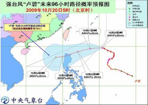 中新網10月20日電 中央氣象臺20日6時發布臺風預報:強臺風“盧碧”將以每小時20公里左右的速度先向偏西方向移動,以后將轉向西偏南方向移動,逐漸向菲律賓呂宋島東北部沿海靠近,強度緩慢減弱。