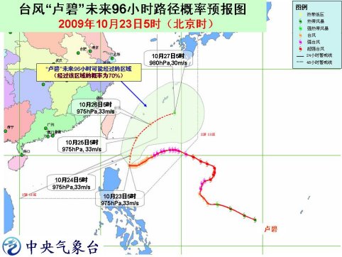 受“盧碧”和南下弱冷空氣的共同影響,23日白天至夜間,臺灣以東洋面、巴士海峽、巴林塘海峽、臺灣東南部沿海將有8-10級大風,部分海域或地區陣風可達11-12級;“盧碧”中心經過的附近海域的風力有11-12級,陣風可達13-14級;臺灣海峽、東海南部、南海東北部、福建中部沿海也將有6-7級大風,部分海域或地區陣風可達8-9級;臺灣東北部有大到暴雨,局部有大暴雨。