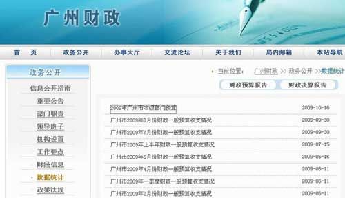 查詢方式為,登陸廣州財政網站()后,點擊打開“政務公開”欄目中的“數據統計”一欄(/zwgk/sjtj/index.htm),可以看到《2009年廣州市本級部門預算》的鏈接,打開之后為一個簡單的114個部門的索引列表。