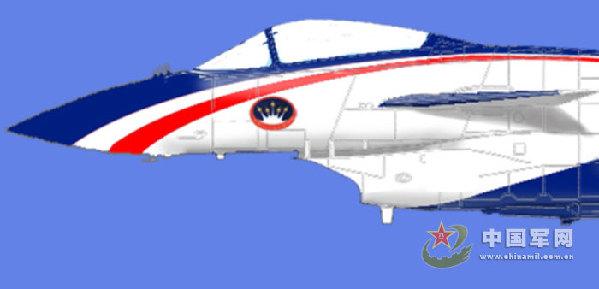 殲-10表演隊的隊徽采用兩個鑲嵌的橢圓,中間是6架戰鷹,在兩個橢圓之間下部噴涂“空軍八一飛行表演隊”字樣。 隊徽顏色采用紅、黃、藍、白四種顏色。噴涂在機頭左右兩側,共2處(見圖12、13)。