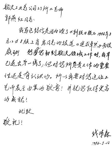 郭燕紅迫不及待地打開(kāi)信。信中用藍(lán)墨水鋼筆工工整整寫(xiě)道:“航天工業(yè)總公司23所工藝師郭燕紅同志:我寫(xiě)這封信是因?yàn)樽x了《科技日?qǐng)?bào)》1996年3月12日8版上肖巖的報(bào)道《追求卓然》而很感動(dòng)!想您初到航天領(lǐng)域工作時(shí),我早已退出第一線了;但對(duì)您所負(fù)責(zé)工作的重要性還是有認(rèn)識(shí)的。所以我要對(duì)您這位工藝師表示由衷的敬意!并祝您取得更高的成就!錢(qián)學(xué)森”。