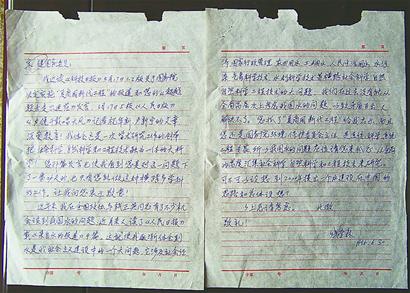 錢學森的這封親筆信共兩頁,圓珠筆書寫,落款時間是1996年6月30日,收信人是當時的國務委員宋健。收藏此信的文敏女士告訴記者,這封信是自己3年前在北京舊書市場上購買到的,當時一起買到的還有幾封名人信札。買回來后,起初也沒有很在意,但后來經過閱讀,才覺出此信具有非常高的價值,便一直珍藏至今。從信中內容得知,錢老不光研究航天科學,對水的問題也很關心,并提出了很好的建議,而這方面以前很少有人提。現在,錢學森的去世讓所有中國人都感到惋惜和悲痛,這時把這封信公布出來,算是自己對老人表達的一份崇高敬意吧。