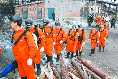 記者跟隨他們來到離二井口約50米的附井口。在井下溢出的漫漫煙氣中,指揮人員大聲對隊員們喊著一些救援注意事項。神情肅穆的隊員們隨即五人一車斗,沿著材料車道緩緩向井下駛去。