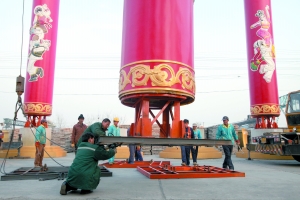 民族團結柱安裝起來并不復雜。首先,把水泥柱墩安放在地面上,然后用吊車將柱身吊起,并豎立起來,工人將柱身底部的固定鋼架卸下,吊車再將柱身緩慢地放置在底座上,工人們再用螺絲將柱身和柱墩固定。