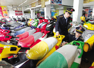 在長(zhǎng)寧路一家銷售店內(nèi),擺放著36輛電動(dòng)自行車,其中20輛的重量超標(biāo)。銷售人員說:“一般只有裝鋰電池的車不超標(biāo),要想達(dá)標(biāo),除非稱重時(shí)拿掉電瓶。”