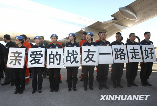 一切安排停當,人群自發聚攏過來,列隊送行。隊員們手中托著“親愛的戰友一路走好”的牌子,表情凝重,注視著飛機在跑道上緩緩滑行。