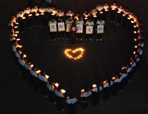 中新網(wǎng)九江一月二十日電 (胡國林)“我們在這里為你們點(diǎn)亮心燭,照耀你們前行的路,祝你們一路走好”,一月十九日晚七點(diǎn)半,在江西九江市晨光中學(xué)的操場上,綿陽班的學(xué)生郭鑫手捧蠟燭,眼含熱淚表示。當(dāng)晚,五十余名綿陽班的學(xué)生點(diǎn)燃蠟燭為在海地地震中遇難的八名中國維和英雄和海地人民祈福。