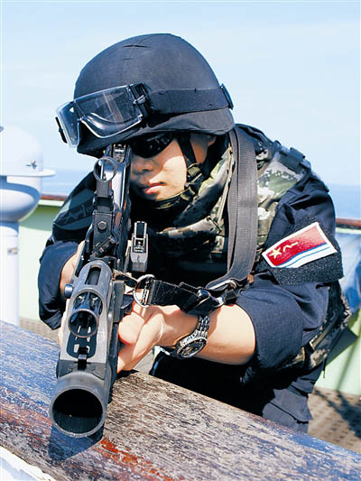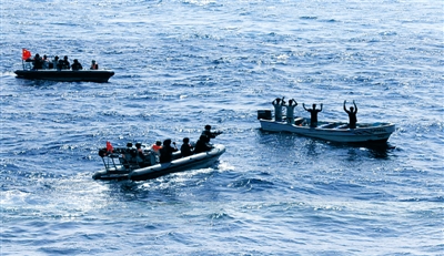 12時28分,巢湖艦在艦載直升機(jī)的引導(dǎo)下鎖定了正在轉(zhuǎn)向“鴻達(dá)號”商船的疑似海盜快艇。在發(fā)射3枚信號彈予以警告后,疑似海盜快艇被迫停車,隨后趕到的馬鞍山艦迅速派出2艘小艇靠近,特戰(zhàn)隊員將其驅(qū)離。