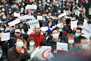 昨日下午1時許,空中不時飄灑著細雨,高明市民劉先生冒雨走在人群中!拔铱吹接薪M織者說24日將舉行這個活動,于是我便報了名。”有網友在論壇上透露,通過論壇信件等各種方式報名的市民已經達到數百人的規模。