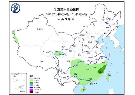 28日08時至29日08時,南疆西部山區及青海東部等地有小雪或陣雪;江南大部、華南大部、四川盆地大部、貴州等地有小到中雨或陣雨。內蒙古、東北、華北、黃淮東部等地有4~6級偏北風,新疆南疆盆地的部分地區有揚沙或浮塵天氣。渤海、黃海北部有6~7級偏北風;黃淮中南部、東海有5~6級偏北風。