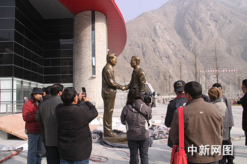 中新網汶川1月29日電(薛升玉 張瑤)1月29日上午,汶川縣體育館前鑼鼓陣陣,“咔嚓”的快門聲不斷,一尊高2.98米、寬1.68米、厚0.94米的“胡主席和溫總理在災區”大型雕塑吸引了許多過往群眾駐足留影。這尊由陜西省大荔縣宣傳部捐贈的大型雕塑,將收藏到汶川縣禹羌博物館。