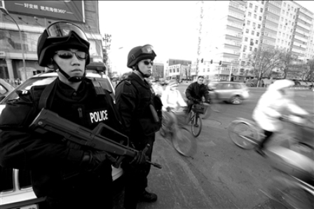 昨天上午,記者在西單文化廣場前看到,一輛武裝處突車閃爍著警燈停靠在路旁,兩名身著作戰服的特警隊員全副武裝,警覺地注視著長安街附近的人流和車流。