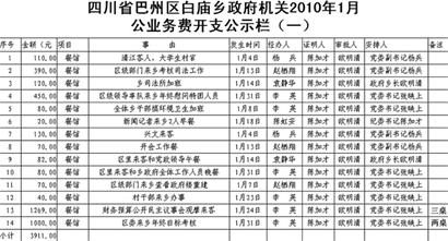 帖子內(nèi)名為《四川省巴州區(qū)白廟鄉(xiāng)政府機(jī)關(guān)2010年1月公業(yè)務(wù)費(fèi)開支公示》的表格顯示,1月份,鄉(xiāng)政府支出公業(yè)務(wù)費(fèi)44筆,共8240.5元,其中最大的一筆開支是,1月24日招待“財務(wù)預(yù)算公開民主議事會觀摩來客”,請客三桌,花費(fèi)1269元,最小的一筆開支僅為“購買信紙”,花費(fèi)1.5元。