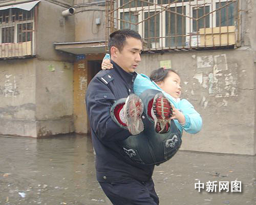大量的融雪性洪水向倉房溝村一帶低洼處涌積,致使土柸結構的居民住房被洪水浸泡,有垮塌之險。另一處的大量洪水涌入近處一棟居民樓,民警立即組織警力進入樓內進行施救,挨家挨戶動員居民撤離住所,并攜老扶幼將婦女兒童帶離危險地帶。