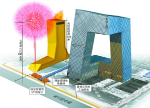 2008年12月下旬,沙鵬、李小華、宋哲元、劉發國4人前往央視工地,確定在央視主樓、配樓間的通道燃放,具體位置在通道西頭,緊挨著三環輔路。隨后劉發國邀請沙鵬、李小華前往廊坊國際酒店看了一場30萬元的焰火表演。