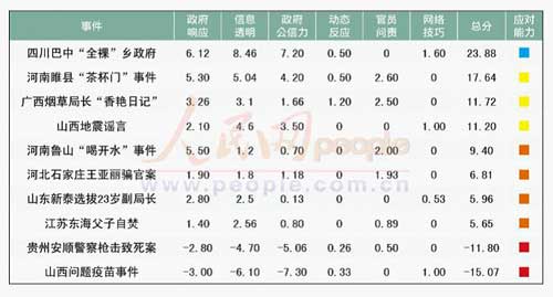 應對有待進一步加強(黃色區域):河南睢縣“茶杯門”事件、廣西煙草局長香艷日記、山西地震謠言;