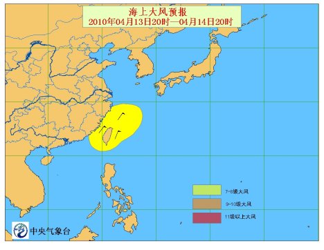 中新網4月13日電 中央氣象臺今日18時繼續發布海上大風預報:4月13日下午2時,黃海大部海域出現了6~7級西北風;東海大部海域、臺灣以東洋面出現了6~7級、陣風8~9級的東北風;臺灣海峽出現了7~8級東北風。臺灣海峽能見度不足10公里。其他海域天氣海況條件較好。